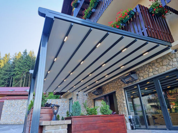 Its smart geometric construction provides maximum strength and wind resistance, while concealed stainless-steel fixings keep the look clean and streamlined. An integrated anti-draught gutter system prevents wind from entering between the canvas, rails, and gutter, ensuring lasting comfort in all conditions.