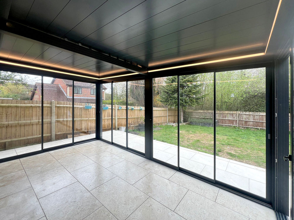 Built-in LED lighting transforms the space after dark, setting the mood for evening dining or relaxation. For an extra touch of luxury and year-round comfort, optional glass sliding walls can enclose the veranda to create a stylish, weather-protected garden room.