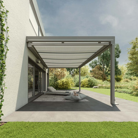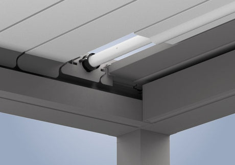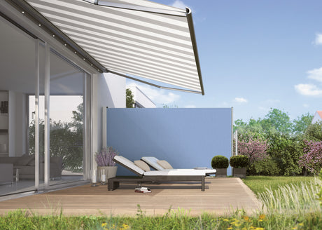 Unlike external awnings, the under-mounted design keeps the fabric protected from wind, rain and dirt, ensuring long-lasting performance and a clean appearance. When extended, the awning creates a soft, pleasant light beneath your patio roof, transforming bright sunlight into a relaxing atmosphere.