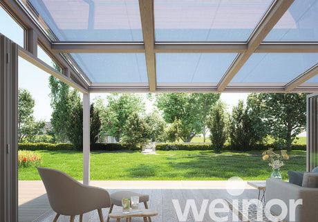 The Weinor Sottezza conservatory awning is a premium under-glass shading system designed for patio roofs, verandas and glass conservatories. Installed neatly beneath the glass, the Sottezza awning provides effective sun protection, glare reduction and temperature control, helping you enjoy your outdoor living space in comfort.