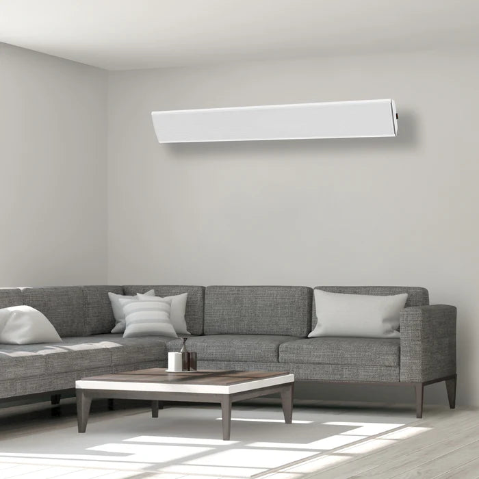 The slimline aluminium body with graphene coating features a clean white finish that blends seamlessly into lighter surroundings. Corrosion resistant and discreet, it can be wall or ceiling-mounted depending on your layout. This model is equally suited to indoor areas such as workshops and garages or fully enclosed outdoor zones like covered restaurant terraces and garden rooms, provided the space is enclosed and shielded from direct rain.